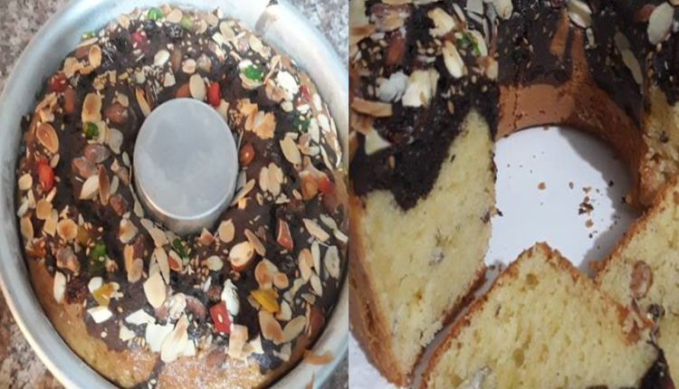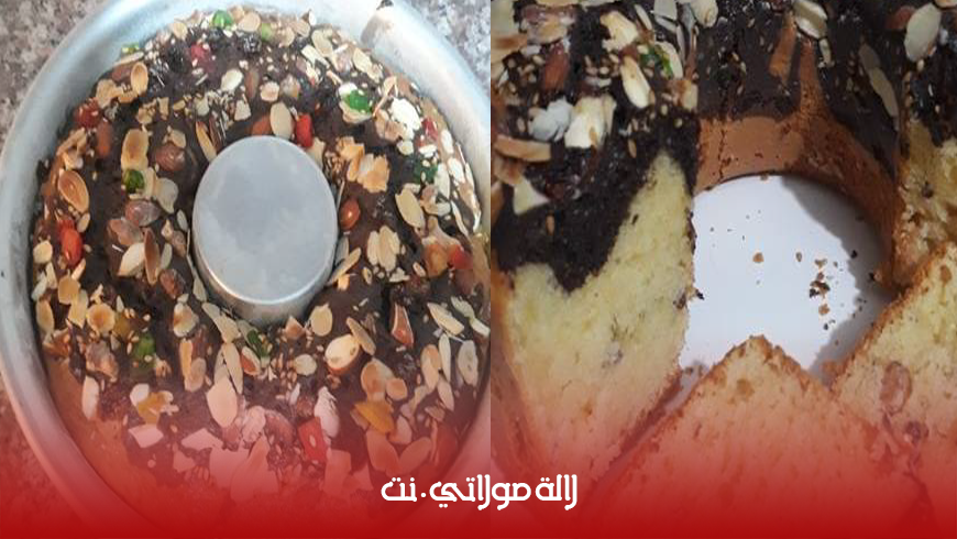 ونفرغو في القالب كيك ونزيد خليط ثاني كاكاو فوقه ونرشو عليه الفوكه كلها وسمسم ندخله في الفرن لمدة 40 دقيقةدرجة حرارة °.١٥٠