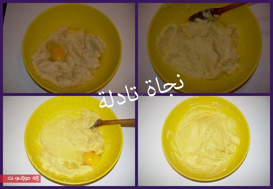 خليت العجينة حتى بردت ضفت لها بيضة مع التخلاط حتى تدخل وسط العجينة