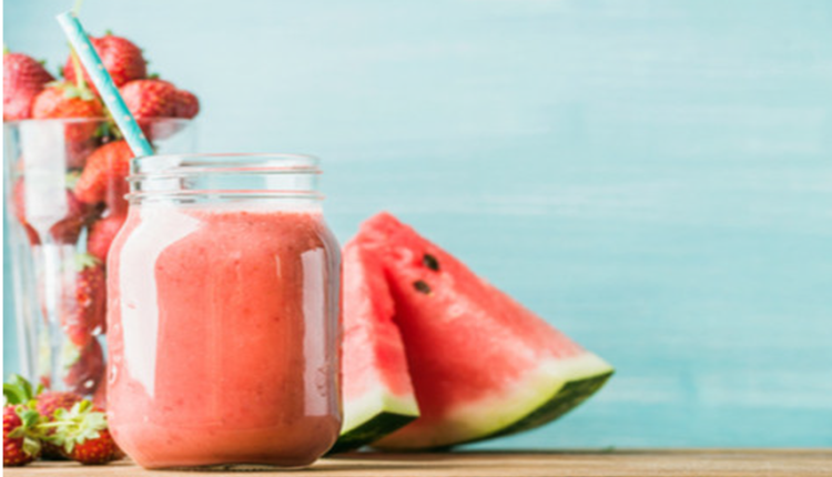 ضعي جميع المكونات في الخلاط لمدة خمس دقائق، مع وضع قليل من قطع البطيخ جانبًا للتزيين. صبي الخليط في كؤوس التقديم، وزينيه بقطع البطيخ، وقدميه باردًا.