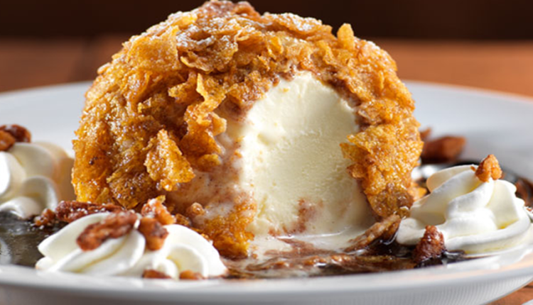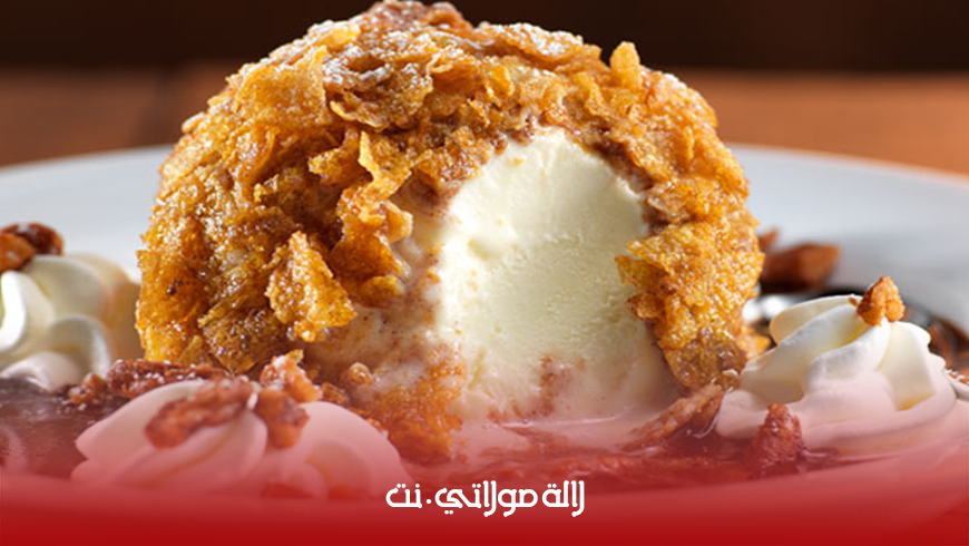 اغمسي كرات البوظة المفرزة بسرعة في بياض البيض ثم بخليط الكورن فليكس والقرفة.