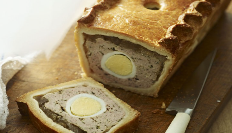 9. لإعداد الهلام: تغمس أوراق الجيلاتين في الماء البارد إلى أن تصبح طرية (كمية الماء ليست مهمة). يصب 450 ملليلتراً من الماء المغلي فوق مكعب المرق، ويحرّك جيداً إلى أن يذوب. يخرج الجيلاتين ويعصر لإزالة الماء الزائد، ويضاف المرق. يحرّك إلى أن يذوب. يدع المرق يبرد قليلاً ثم يصب في الفطيرة، وتستخدم أكبر كمية ممكنة. تعاد الفطيرة إلى الثلاجة ويدع الجيلاتين يستقر قبل تقديمها.