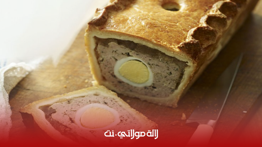 4. يوضع بعض مزيج اللحم في القاعدة، ثم يرتب البيض المسلوق على شكل صف ويوضع فوقه مزيج اللحم المتبقي.