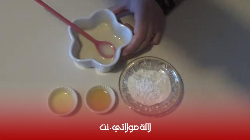 - المكونات : ملعقة من دقيق الأرز الناعم + ملعقة من العسل الطبيعي + ملعقة من زيت الذرة + بياض بيضة