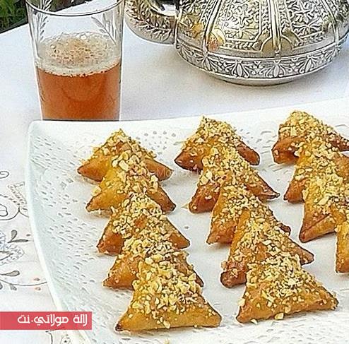 نقطع أوراق البسطيلة إلى شرائط ونضع على طرف الشريط كرة من الحشوة نبسطها قليلا ثم نطوي للحصول على شكل مثلث ونلصق طرف الشريط بخليط من الدقيق والماء .