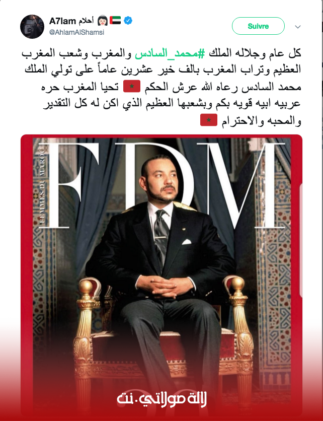 وكتبت أحلام في تغريدتها: “كل عام وجلالة الملك محمد السادس والمغرب وشعب المغرب العظيم وتراب المغرب بألف خير، عشرين عاماً على تولي الملك محمد السادس رعاه الله عرش الحكم، تحيا المغرب حرة عربيه أبيه قويه بكم وبشعبها العظيم الذي أكن له كل التقدير والمحبه والاحترام”.