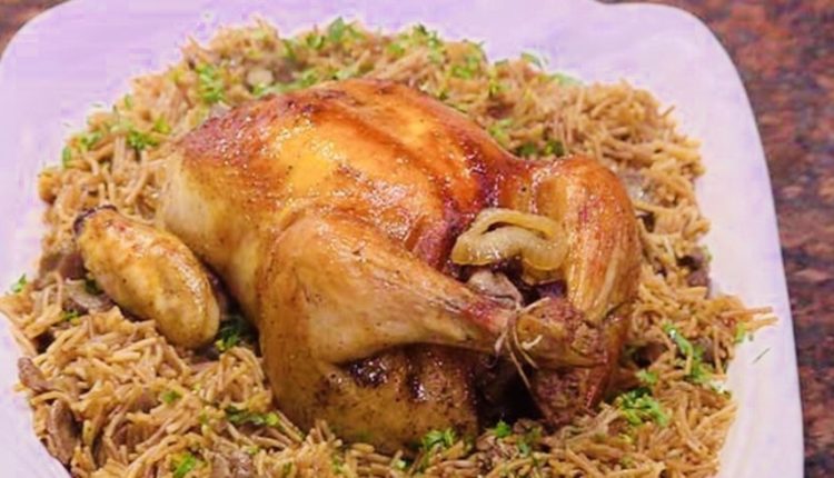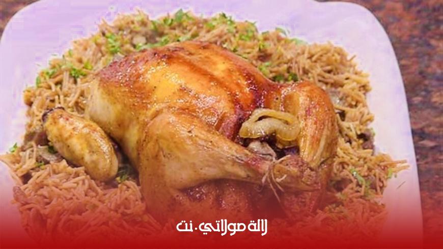 بعد ترك الدجاج ليلة كاملة ، نأخذ الدجاج ونضعه في الطنجرة فوق نار هادئة ثم نغلق الطنجرة كي يتبخر الدجاج بذلك البخار المحبوس في الداخل . نأخذ كبدة الدجاج نغسلها جيدا ثم تقطع إلى قطع صغيرة وتشرمل هي أيضا بالبصل، البقدونس والتوابل وقليل من الزيت ونضعها في مقلاة على نار خفيفة ونحركها ، بعد ذلك نأخذ الشعرية الصينية نضعها في الماء الساخن 5 دقائق ثم تدهن بالزيت . عندما يسحب الدجاج من الطنجرة التي تبخر فيها ندخله الفرن كي يتحمر ونضع الشعرية الصينية كي تطبخ هي الأخرى لمدة 10 دقائق وتدهن بالزبدة كي لا تلصق ، بعدها نضيف عليها الكبدة مع الزيتون المقطع ونخلط كل من الشعرية والكبدة والزيتون جيدا ونضعه في الصحن المراد تقديمه ونضع فوقه الدجاج المحمر .