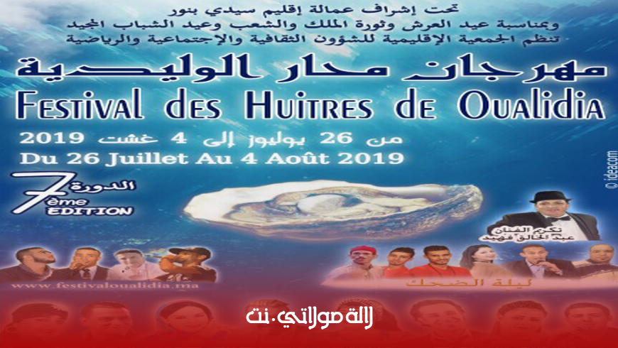 تماشيا مع الدينامية التنموية والثقافية والاقتصادية والاجتماعية التي تعرفها مدينة الوليدية بفضل العناية الملكية السامية لصاحب الجلالة الملك محمد السادس ، وتخليدا لذكرى عيد العرش المجيد ، تنظم الجمعية الإقليمية للشؤون الثقافية والاجتماعية والرياضية ، تحت إشراف عمالة إقليم سيدي بنور ، فعاليات الدورة السابعة من مهرجان محار الوليدية ما بين 26 يوليوز و04 غشت 2019.
