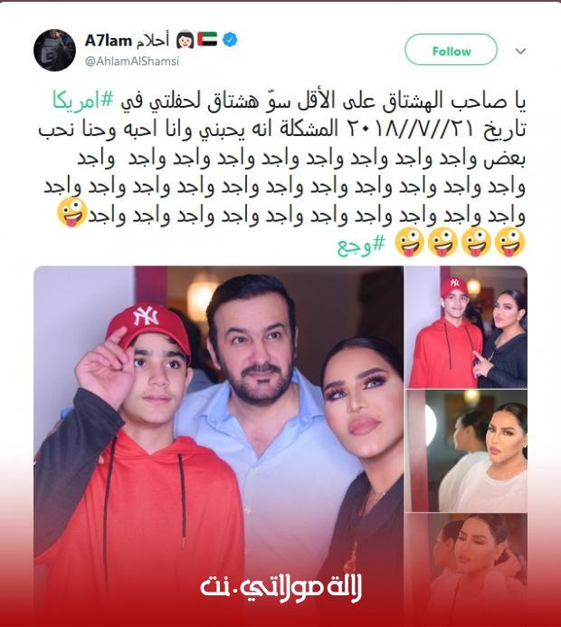 علقت الفنانة أحلام بسخرية شديدة عبر حسابها الرسمي على “تويتر” على شائعة انفصالها، فنشرت مجموعة صور تجمعها بزوجها معلقة عليها: “يا صاحب الهاشتاج على الأقل اعمل هاشتاج لحفلتي في #أميركا تاريخ 21 يوليو 2018 المشكلة إنه يحبني وأنا أحبه”.و قصدت أحلام زوجها القطري، واستكملت منشورها بتكرار كلمة “وإحنا نحب بعض واجد واجد” مرات كثيرة.