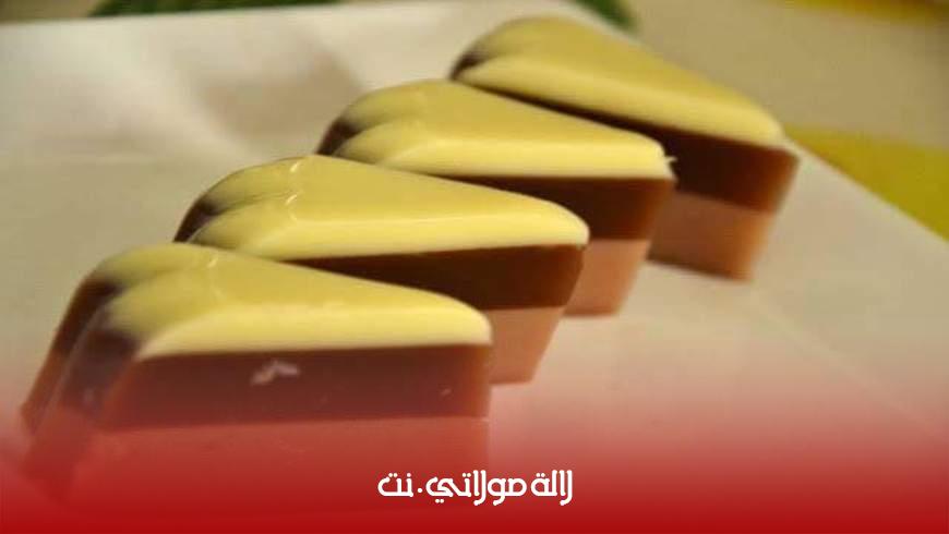 الطبقه الثانية.يغلى كوب حليب مع ظرف كريم كراميل و 4 ملاعق من الكاكاو و يترك جانباً حتى يبرد قليلاً ثم يصب فوق الطبقه الاولى ويترك مجدداً جانياً حتى يتماسك