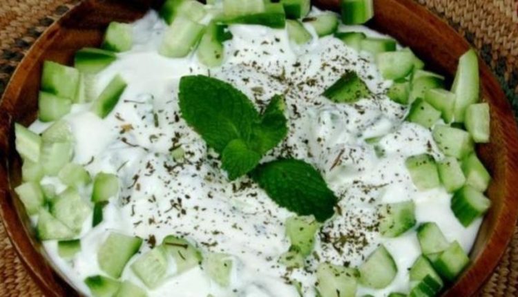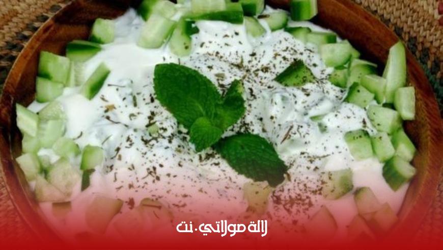 نقوم بوضع الياغورت في إناء عميق، ونضيف الثوم، الملح، مكعبات الثلج، نمزج جميع المكونات حتى تتجانس بينها ثم نضيف قطع الخيار و النعناع