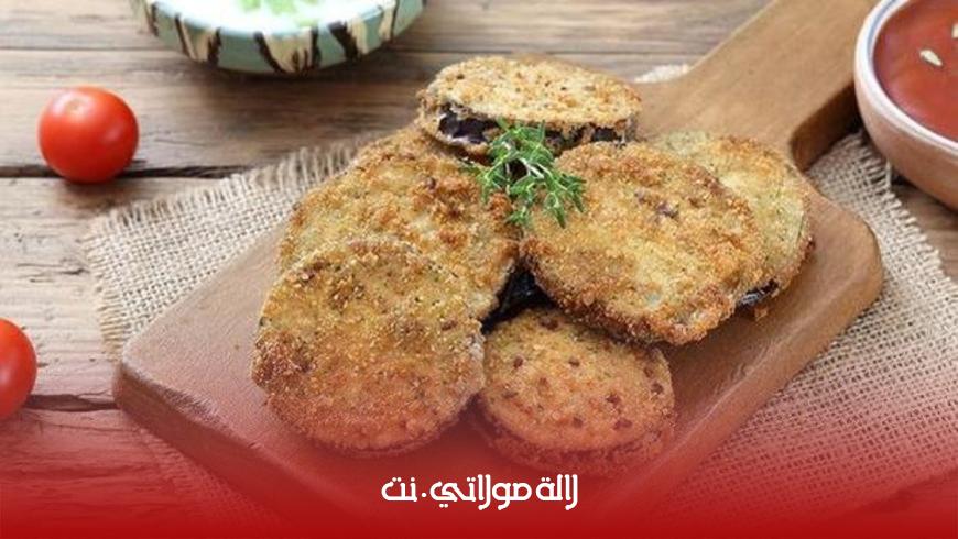 توضع شرائح الباذنجان في الدقيق ثم البيض ثم في خليط الجبن والخبز المحمص