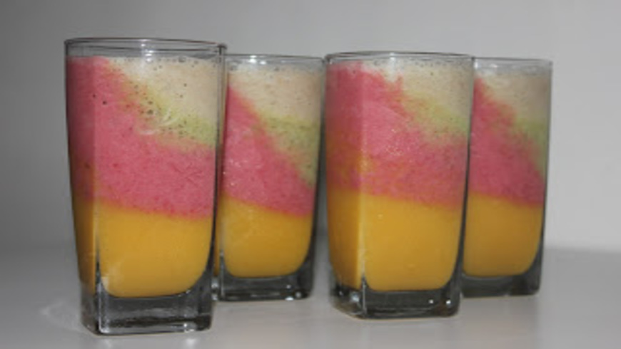 نقوم بمزج كل صنف من الفاكهة مع ربع كأس من الماء وملعقتين كبيرتين من الحليب المركز ونصب في كؤوس التقديم القليل من كل عصير واحد فوق الاخر