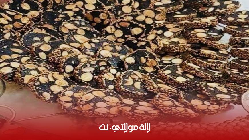 كندوب شكلاط فحمام مريم ونزيد عليه تمر ونخلطهم مزيااان حتا يتجانسو.نزولهم من فوق النار ونضيف اللوز نكون نشفتو من زيت.نخلطهم ونخليه يبرد.نفرش ميكة بيضة وناخد كمية من لخليط نعمل حرابل ندوزهم فجنجلان وندخلهم للمجمد حتا يشدو راسهم ونبدا نقطع.