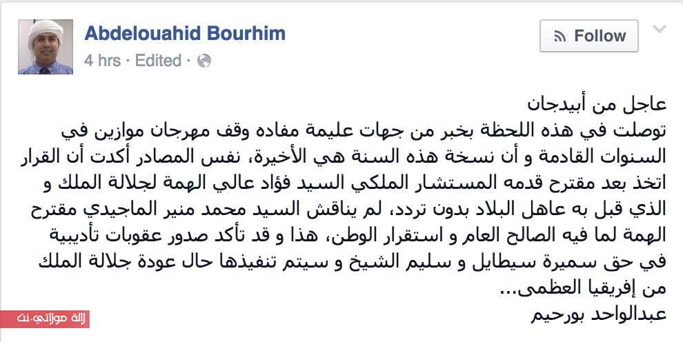 القيادي السابق أوضح على صفحته الفايسبوكية ، أن القرار اتخذ بأبيدجان ، بعد مقترح قدمه المستشار الملكي السيد فؤاد عالي الهمة لجلالة الملك و الذي قبل به عاهل البلاد بدون تردد، و لم يناقش محمد منير الماجيدي رئيس جمعية مغرب الثقافات، المنظمة للمهرجان، مقترح الهمة لما فيه الصالح العام و استقرار الوطن.