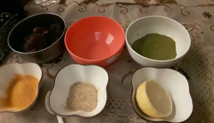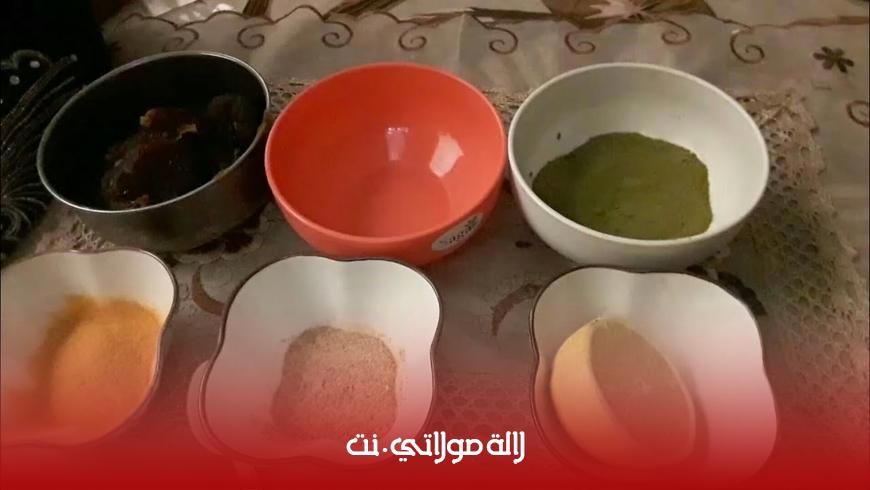 • المكونات : ثلاثة ملاعق حناء+الصابون البلدي+كأس صغير من عصير الليمون (الحامض)+ملعقتين من الخميرة+كأس كبير من الماء الدافئ+ملعقة من الكركم +ملعقة من القهوة بودرة .