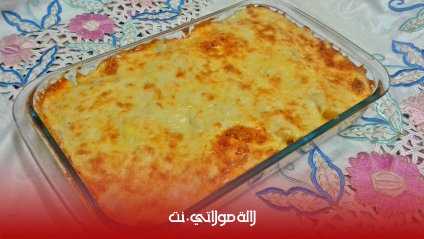 - طريقة التحضير:نضع في قدر الدجاج، والزيت، والبصل، والملح، والقرفة، والفلفل الأسود، ونصف كوب من الماء حتى تتبخر كمية الماء. نفتت كمية الدجاج، ونضيف البيض، والحليب، والجبن الأبيض. نخلط المكوّنات السابقة، ونضعها في وعاء زجاجي مدهون الزبدة، ونضع الجبنة المشورة على الوجه. نّدخل الوعاء إلى الفرن حتى ينضج.