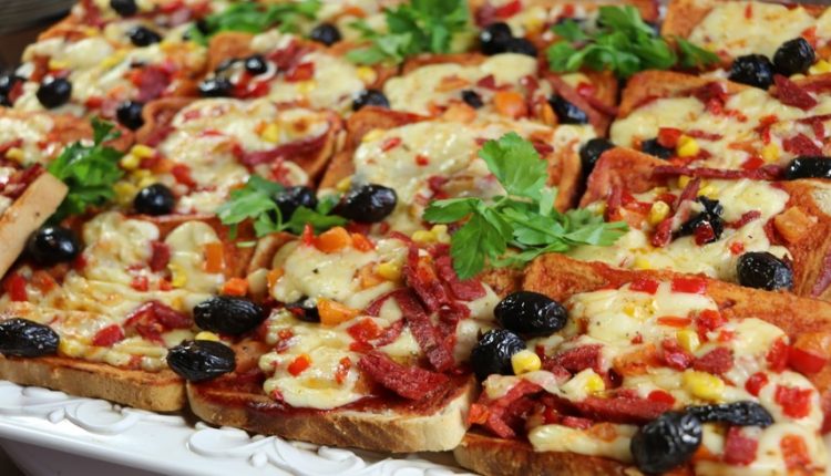تدهن شرائح الخبز بزيت الزيتون ويدهن فوقها معجون الطماطم ثم تفرش شرائح الجبن فوقه ويوضع عليه مربعات من الفلفل الحلو الطماطم السمك والزيتون