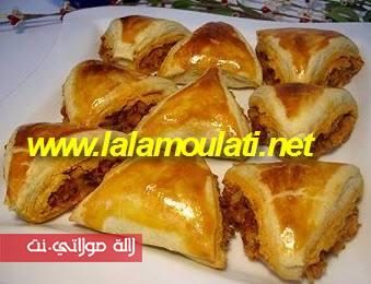 نضع الحشوة على طرف العجينة و نلفهااا و نقطع مثلثات