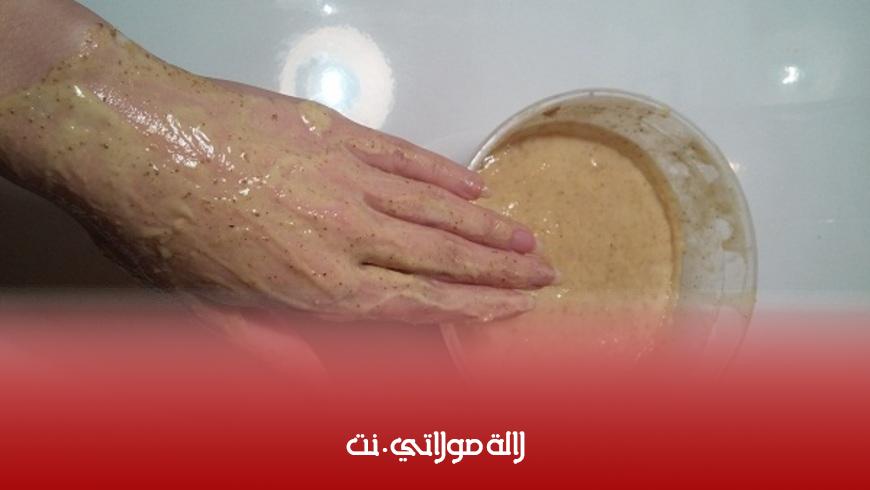 نوضعوا الخليط على الوجه واليدين والارجل ونخلوه حتى ينشف ونبرموه ونغسلوه بماء دافي ونوضعوا على الوجه ماسك مغدي ولليدين والارجل كريم مغدي