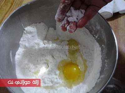 في آنية نضع الدقيق مع باقي مكونات العجينة و نجمع بالماء حتى نحصل