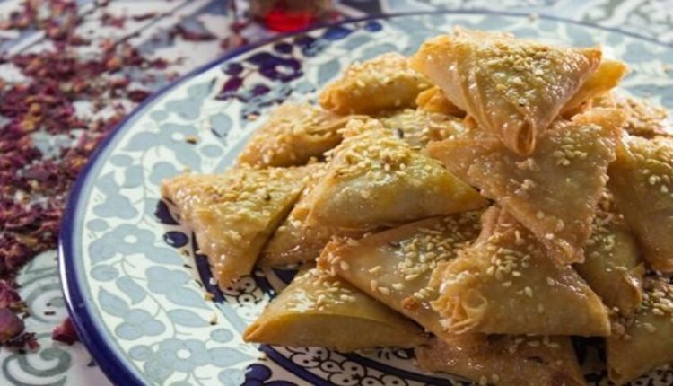 * عندما ننتهي من طي البريوات تقلى في حمام زيت ساخن حتى تأخذ لونا ذهبيا. ثم تغطس بعد ذلك مباشرة فب العسل الساخن لمدة خمس دقائق لتتعسل.