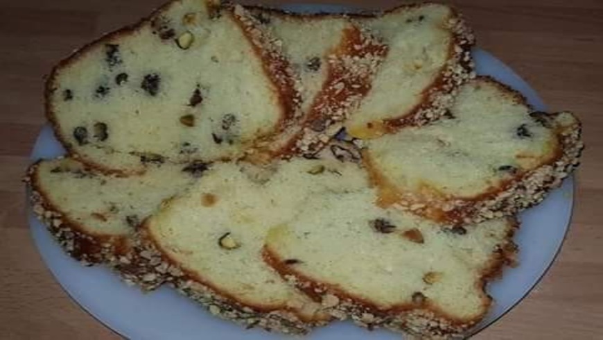في الخلاط الكهربائي نعمل البيض سكر 1فأني رشة ملح ونطحنو الخليط مزيان ونضيف زيت ونطحنو الخليط مرة ثانية ونضيف ماء وحليب بودرة ودانون ونطحنو مزيان ونكوب الخليط في إناء ونزيد عليه دقيق والخميرة ونخلط مزيان ونزيدو قشرة حامضة ومعلقة كبيرة خل ونخلط مزيان ونزيد الفواكه الجافة بعد منكون ضيفنا عليهم معلقة كبيرة من دقيق ونخلط مزيان وندهن المول بزبدة ونرش بالدقيق وإلي الفرن الحرارة 170 45 دقيقة غير من تحت حتى طيب ونشعلو الفوق تتحمر شوية وصافي تزين ندهن كيكة بالمربى الخوخ ونرش عليها اللوز مقلي ومهرمش وبالصحة والراحة
