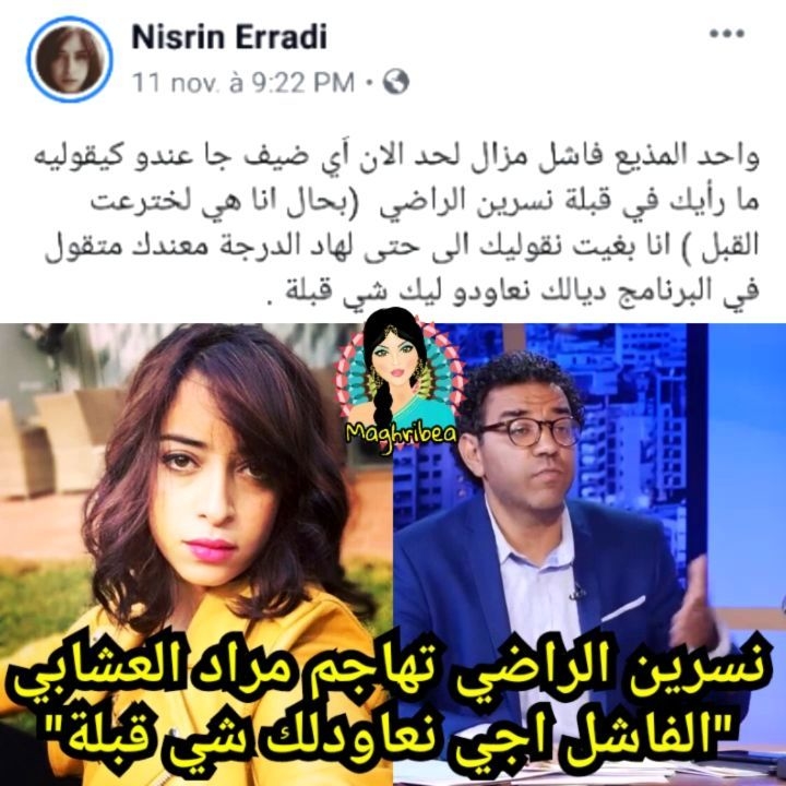 هاجمت الممثلة المغربية نسرين الراضي مقدم البرامج والممثل مراد العشابي، بسبب استغلاله للجدل الذي خلقته “قبلتها” الشهيرة في مهرجان كان، حيث أبدت انزعاجها من إقدام العشابي على طرح السؤال عن القبلة على ضيوفه في كل مرة.