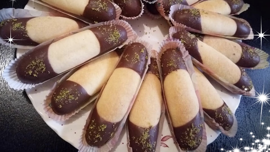 بعد ان تصبح الحلويات المغربية جاهزة نغطس الاطراف في الشكلاط الذائب و تزين حسب الرغبة