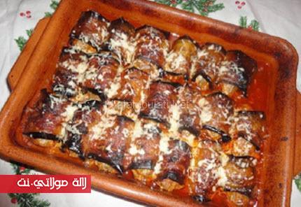 ثم نلف كل أصبع كفتة داخل كل شريحة بادنجال لنحصل على بادنجال محشو بالسردين،في صحن الخاص بالفرن،نضع صلصة الطماطم الجاهزة ونضع عليها البادنجال المحشو على الشكل التالي