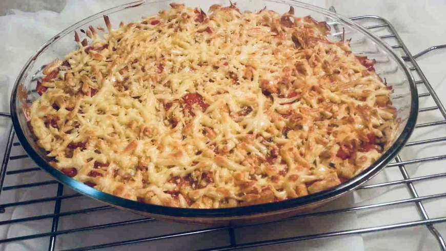 الان نأخذ السباغيتي نصفيها من الماء و نضعها بقدر أو قالب زجاجي يتحمل الحرارة نسوي العجائن و نملس السطح ثم نوزع صلصة الطماطم على سطع العجائن بالتساوي بعد ذلك نوزع مكعبات الفلفل الاحمر الحلو وبعدها نوزع الدجاج و في النصف الاخر نضح سمك التونة .