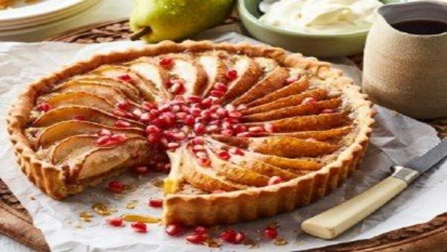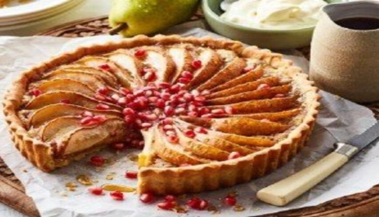 نخلط الزبدة والسكر بالخلاط الكهربائي حتى يصبح المزيج كريمياً ثم نضيف البيض ومسحوق اللوز والدقيق وشراب القيقب ونحرك حتى تمتزج المكونات جيداً . نسكب المزيج فوق العجينة ونرش فوقه حبات الرمان ونوزع شرائح الإجاص ونضغطها داخل المزيج . نضع القالب في الفرن لمدة 45 دقيقة ثم نتركه جانباً لمدة 10 دقائق حتى يبرد . نزين القالب بشراب القيقب أو العسل وحبات الرمان ونقدمه مع الكريمة الشهية .