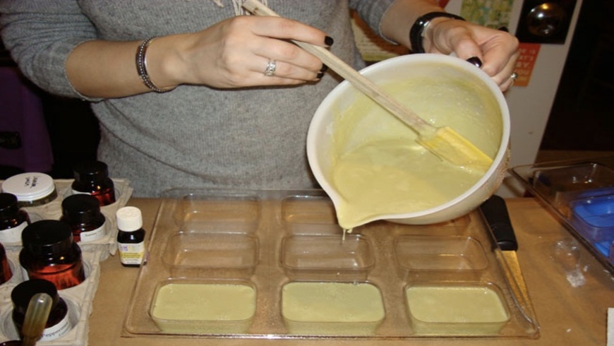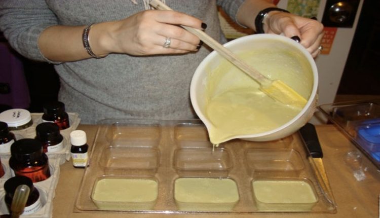 في مقلاة ضعي الصابون المبشور ،مع التحريك المستمر بعد ذلك اضيفي باقي المكونات،ثم ضعيع في قوالبب وادخليه للمجمد.