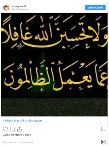 في حين نشرت الممثلة امال صقر صورة على حسابها الشخصي صورة مكتوبة عليها ” وَلَا تَحْسَبَنَّ اللَّهَ غَافِلًا عَمَّا يَعْمَلُ الظَّالِمُونَ ” في إنتظار خروج إعلامي توضح فيه هذه الإتهامات الموجهة لها.