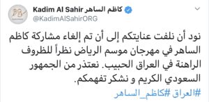 وكتب على حسابه الرسمي في “تويتر”: “نود أن نلفت عنايتكم إلى أنه تم إلغاء مشاركة كاظم الساهر في مهرجان موسم الرياض نظراً للظروف الراهنة في العراق الحبيب”.