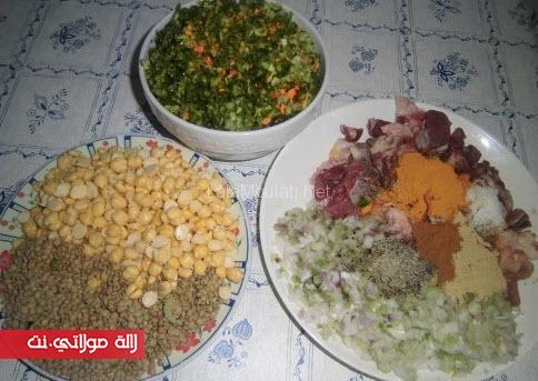 تقريبا زلافة صغيرة حمص مفسخ _ تقريبا كأس عدس _ لحم مقطع تقريبا رابعة أنا درت غنمي وانتم ليكم الاختيار _بصلة مشلظة _ كرافس ومعدنوس وقزبر مقطعين _ 2 معالق صغار سكين جبير _ 2 معالق صغار خرقوم _ ملعقة صغيرة إبزار __ملعقة صغيرة قرفة _ ملون _ ملح _ ربع كاس زيت