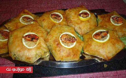 في طنجرة على النار نذوب شوية الزبدة و نضيف لها شوية زيت نضيف البصل و نخليه يتقلى حتى يذبل و نضيف الفلفل الأخضر و الأحمر و الجزر المحكوك نترك الكل فوق النار حتى ينضج نضيف الفطر والتوابل (ملح والكمون +تحميرة+ابزار+هريسة) و القزبر و المعدنوس نترك الكل فوق نار هادئة . في مقلاة اخرى نذيب القليل من الزبدة و الزيت ونضيف شوية ثومة و شوية قزبر و معدنوس و عصير الحامض ثم نضيف القمرون و نتركه لدقائق فقط.تم نزيله من على النار نفس العملية نقوم بها بالنسبة لشرائح السمك الأبيض بعدما نقطعها مربعات صغيرة. نغلي الماءومربع مرق الخاص بالسمك و نصبه على الشعرية الصينية.نتركه دقيقتين ثم نصفيها و نقطعها نضيف القمرون و السمك الأبيض و الشعرية الصينية للخليط الأول و هاهي الحشوة جاهزة نأخد أي قالب صغيراو زلافة صغيرة نفرش و سطها ورقة بسطيلة تم نضيف نصف ورقة في الوسط حتى لا تتمزق الورقة الأولى و تخرج الحشوة تم نملا بالقليل من الحشوة ونجمع الاطراف مع دهنها بالفرشاة بالزبدة المذابة ثم نقلب فوق اليد و نضعها فوق صينية الفرن نستمر حتى نهاية الحشو نضعها فوق صينية الفرن. تتحمر ونزينها بحبات القمرون والحامض و نقدمها بصحة والراحة