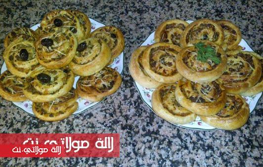 نسرح فوقهم الحشوة بالتساوي ونضيف الزيتون أسود مقطع ثم شوية الفرماج محكوك