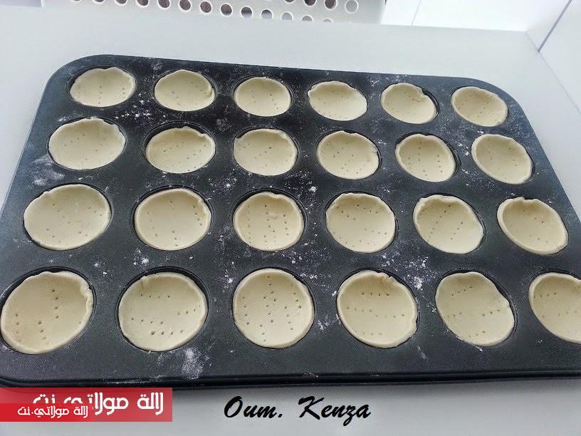 نسرحو العجينة ديالنا و نقطعوها و نثقبوها بالفورشيط و نستفوها فمول الكب كيك الصغير، ثم نعمروها بالحشوة ديالنا