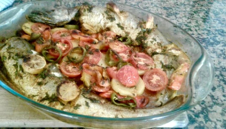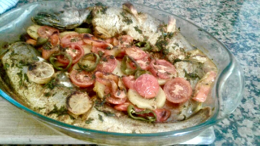 نصلقو الجزر وبطاطس ونقطعوهم دوائرتم نوضعها الكل في المول ديال الفرن ونضع السمك و الخضر وطماطم مقطعة دوائر مع الفلفل ثم إلى الفرن