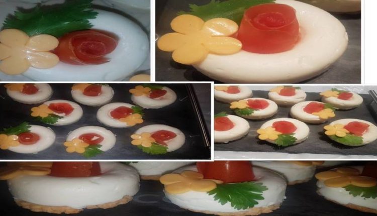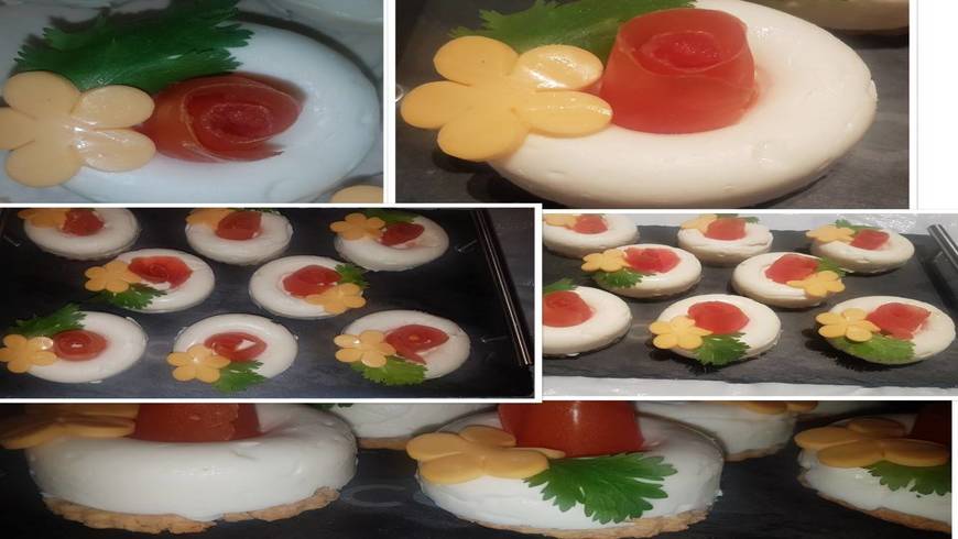 نخلط الحليب والنشا وشوي ملح نخلطهم عند تكاثف الخليط نضيف الجبن وزبدة نضعها في قوالب السيليكون وندخلها الثلاجة 2ساعتين حتى تبرد تماما ونلسقها بالخليط المتبقي والتزيين اختياري
