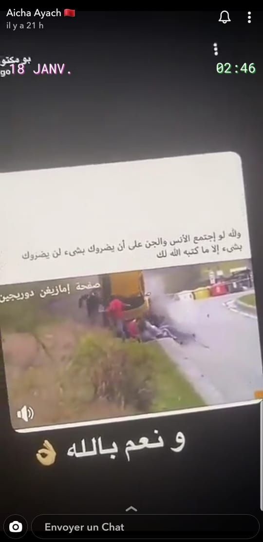 ونشرت عياش أمس مقطع فيديو عبر خاصية الستوري بحسابها على تطبيق السناب شات، يوثق للحظة نجاة 4 شبان من موت محقق بعد تعرضهم لحادثة سير خطيرة بالمغرب.