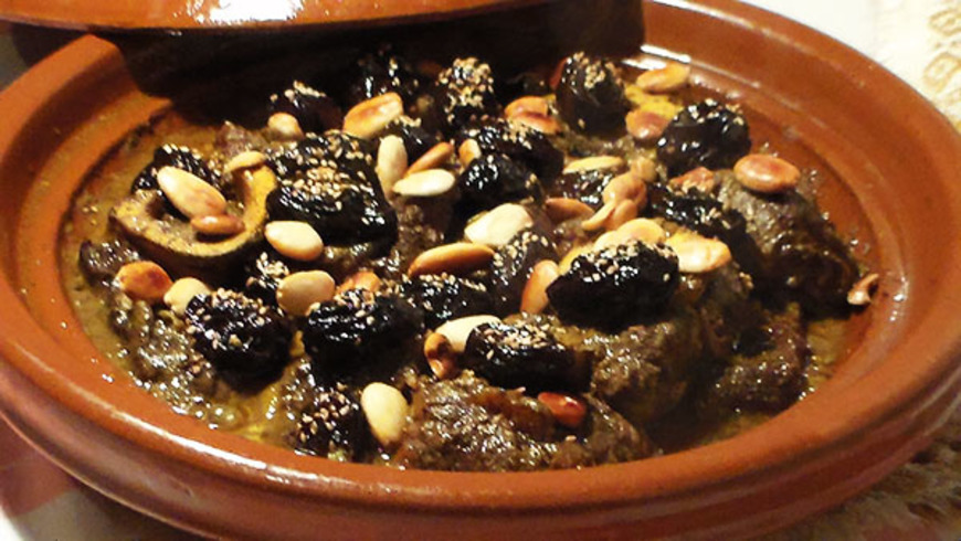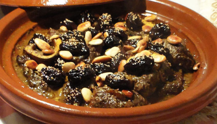 يصفف اللحم في طبق التقديم ويزين بالبرقوق المعسل.