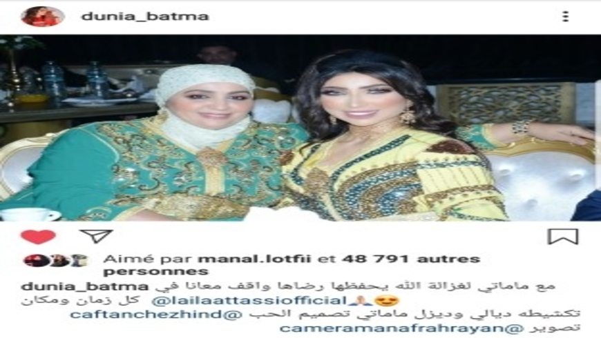 شاركت الفنانة المغربية، دنيا بطمة، صورة لها رفقة والدتها، ليلى أطاسي، مع متابعيها عبر حسابها الشخصي على موقع إنستغرام.