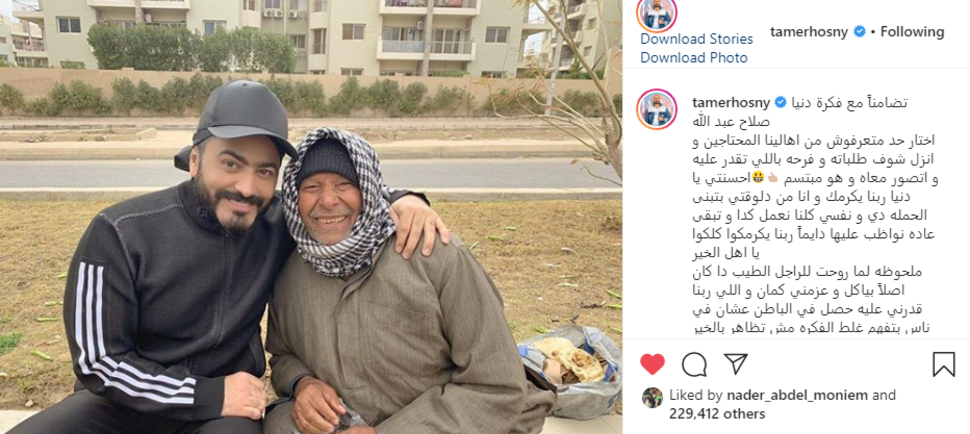 وكتب تامر حسني قائلاً: “تضامناً مع فكرة دنيا صلاح عبدالله اختار حد متعرفوش من اهالينا المحتاجين و انزل شوف طلباته و فرحه باللي تقدر عليه و اتصور معاه و هو مبتسم احسنتي يا دنيا ربنا يكرمك و انا من دلوقتي بتبنى الحمله دي و نفسي كلنا نعمل كدا و تبقى عاده نواظب عليها دايماً ربنا يكرمكوا كلكوا يا اهل الخير”.