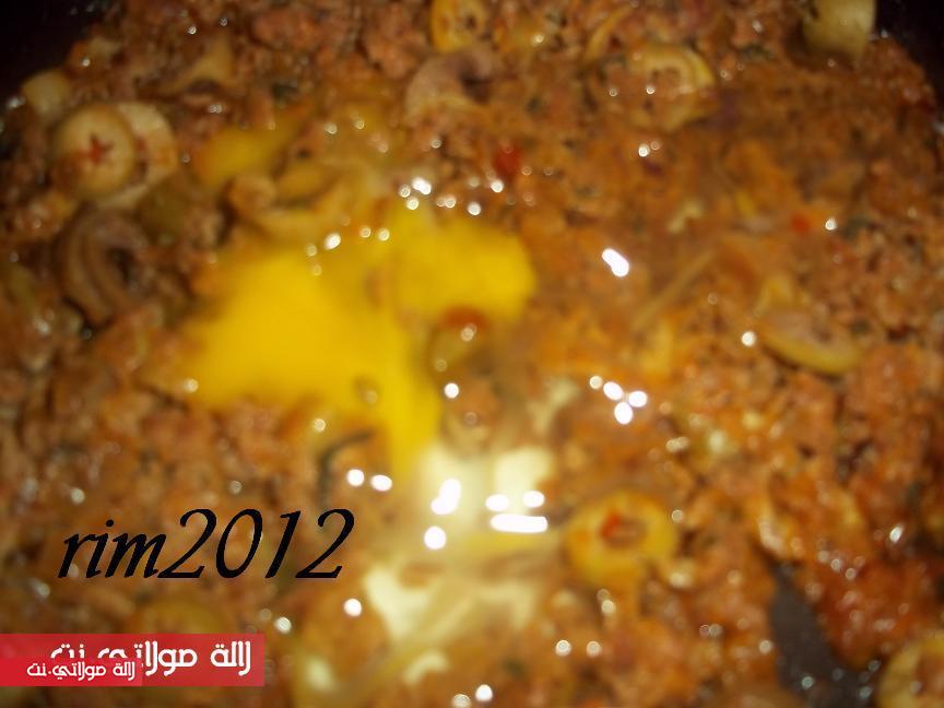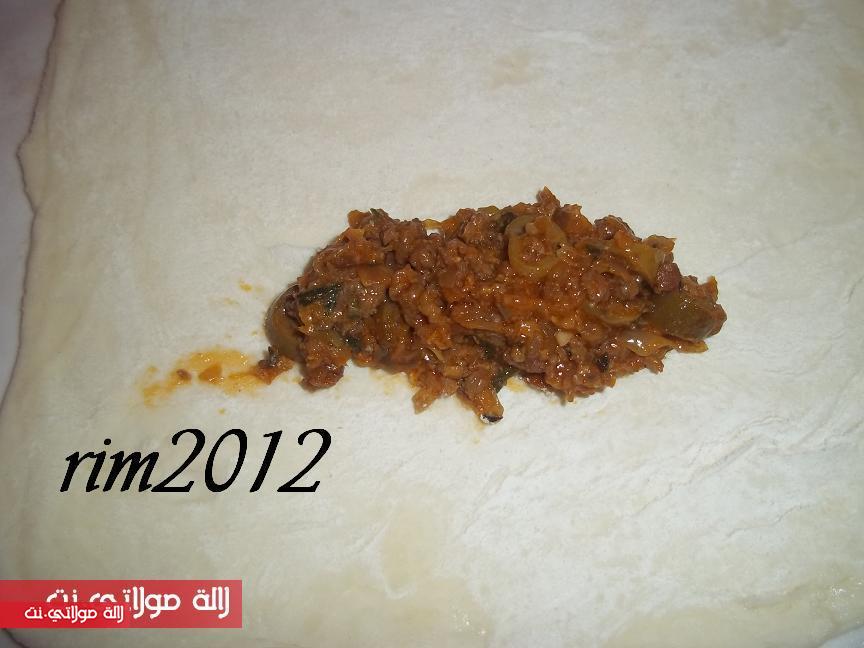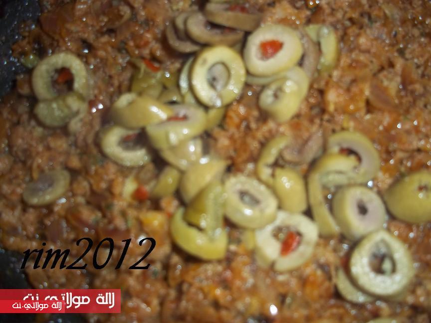 ونعملو شويش دالحشوة المكونة من الكفتة متبلة ومشحرة مع بصلة ونضيفو ليها الزيتون