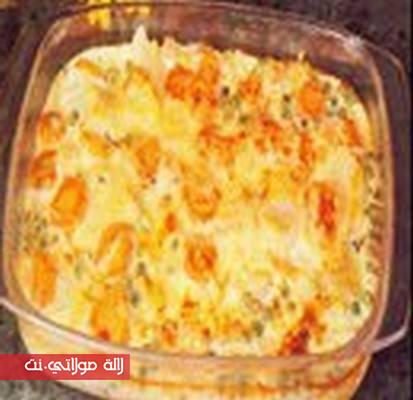 * يوضع الكل في وعاء صالح للفرن مدهون بقليل من الزبدة ومرشوش بالطحين