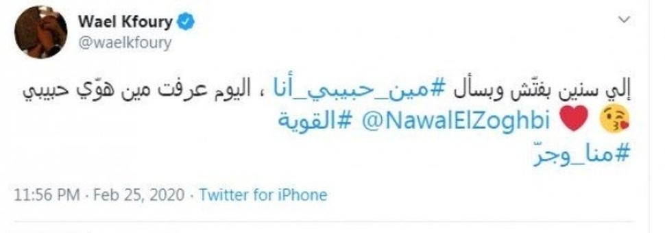 اعترف وائل كفوري بحبه للفنانة نوال الزغبي علناً من خلال تغريدة له عبر “تويتر” فور أن أعلنت النجمة اللبنانية خبر طلاقها من خلال برنامج “منا وجر”، والذي تحدثت فيه أيضاً عن أزمة قتيل منزل نانسي عجرم موجهة رسالة للأخيرة.