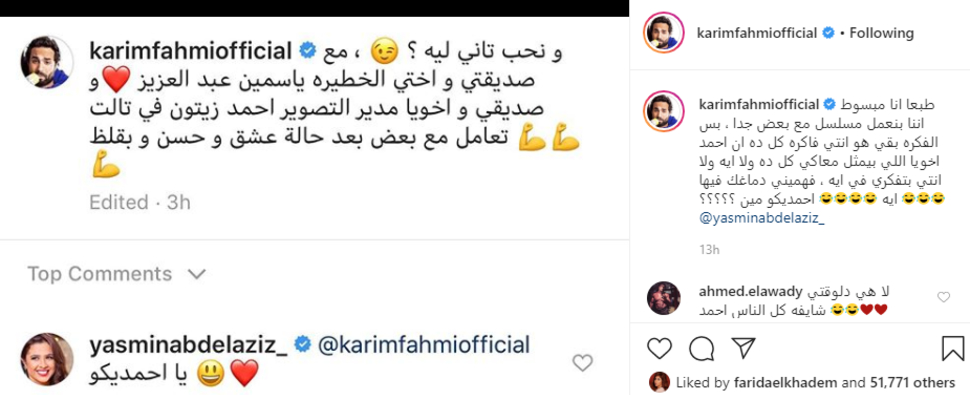 وهنا حرصت ياسمين عبد العزيز على الرد على كلمات كريم فهمي فوقعت في خطأ وضعها في مأزق بقولها: “يا أحمديكو”، وعلى الفور علق كريم فهمي على ما كتبته ليسألها هل تقصد شقيقه أحمد فهمي أم هناك أمر آخر قائلاً لها: “طبعا انا مبسوط اننا بنعمل مسلسل مع بعض جدا، بس الفكرة بقي هو انتي فاكرة كل ده أحمد أخويا اللي بيمثل معاكي كل ده، ولا ايه ولا انتي بتفكري في ايه، فهميني دماغك فيها ايه، احمديكو مين؟”.