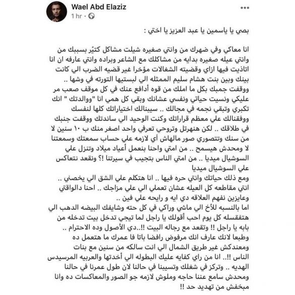 ولكن هذا الاعتراف لم يكن بالصدفة، وإنما قصد من خلاله الثنائي الرد على شقيق ياسمين عبد العزيز الذي نشر تدوينة طويلة عبر حسابه على الانستغرام استنكر من خلالها العلاقة السرية التي تجمع شقيقته بأحمد العوضي قائلا: ” بصي يا ياسمين يا عبد العزيز يا أختي، أنا معاكي وفي ظهرك من وأنتِ صغيرة شيلت مشاكل كتيًر بسببك ووقفت جنبك بكل ما أملك من قوة أدافع عنك في كل موقف صعب مر عليكي، ونسيت حياتي ونفسي علشان تبقي نجمة في مجالك”.