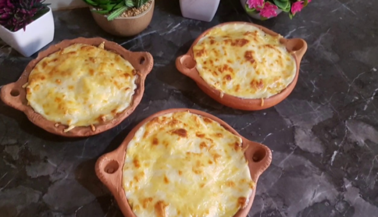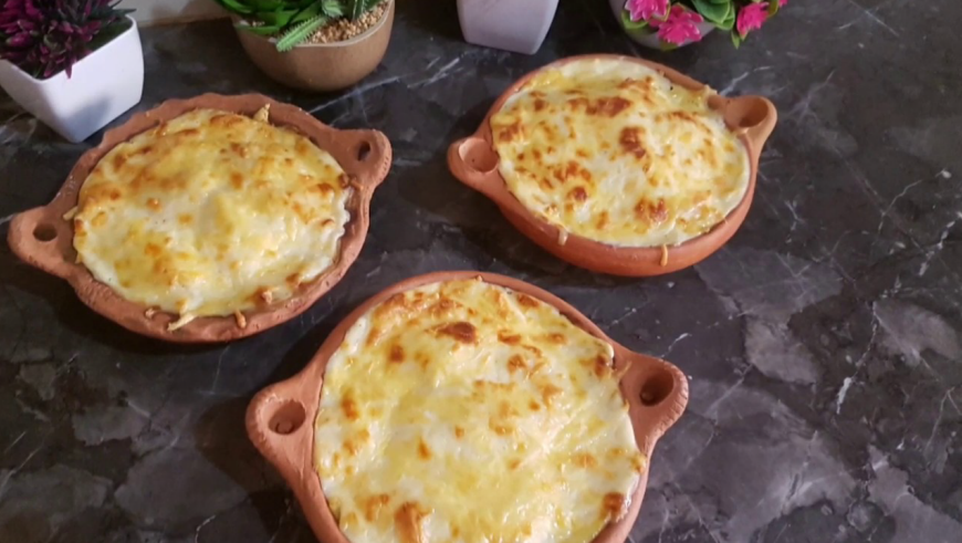 نتبل الدجاج جيدا و نتركه في الثلاجة مدة ساعتين، في مقلاة نضع ملعقة كبيرة من الزبدة و نضيف الدجاج المتبل و نقوم بتحريكه جيدا على نار هادئة مع تغطية المقلاة حتى يتحمر الدجاج. نقشر البطاطس و نضعها في إناء به ماء مغلي لمدة 3 دقائق ثم نصفيها جيدا و نقوم بقليها في الزيت، بالنسبة للصلصة في إناء على نار هادئة نضع الحليب و الدقيق و قطع الجبن و الملح و الابزار مع التحريك المستمر حتى يعقد الخليط ثم نضيف الجبن المبشور